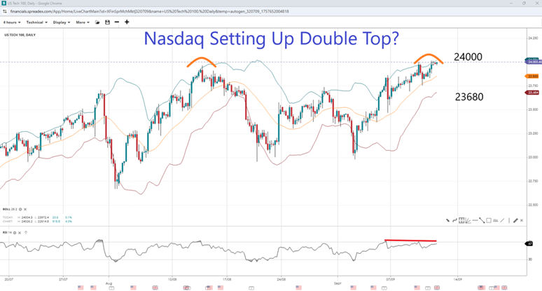 The US tech-weighted index has been trending higher all week but has yet to overcome the psychologically important 24k level. Despite recent gains, the RSI has not yet entered overbought territory, reinforcing the theory that it could continue to rise due to Fed rate cuts, potentially reaching levels of 24250 and 24500. On the other hand, if the resistance holds firm and the divergence plays through, the Nasdaq could be setting up a double top. A downward move could encounter support at the lower Bollinger Band of 23680, which is near the close after Friday's disappointing NFP numbers. A break below could expose 23500 and the 23k handle.