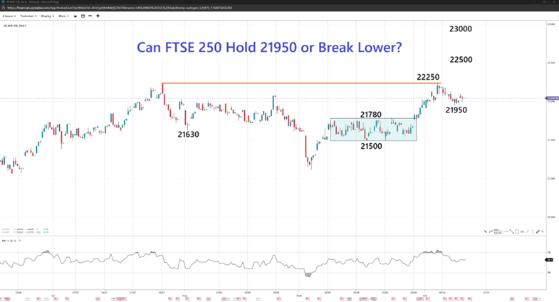 The FTSE 250 broke outside its 3-week consolidation between 21780 and 21500, forming the second point of a double top near 22250. This was followed by a pullback as the RSI entered overbought territory and began sloping downward. The FTSE 250 has rejected the local high around 22090. If support at 21950 fails to hold, the FTSE 250 could fall toward local lows at 21630 and 21500 as bearish pressure intensifies. However, a break above 22090 could open the door toward 22500 and 23000, provided that 22250 fails.