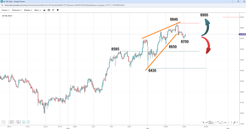 The UK100 index has formed a bearish wedge pattern, which could signal a potential pullback if the 8650 support and 8585 resistance levels are breached, exposing 8430. Conversely, if the 8840 level gives way to bulls, the index could accelerate towards the next round level at 8900, then even 9000.