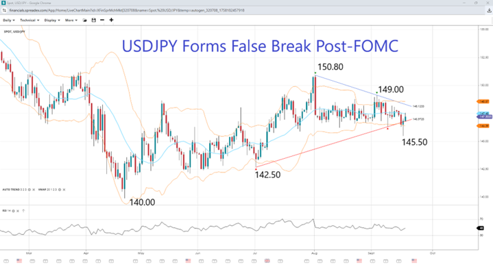 After the Fed cut rates on Wednesday, the immediate reaction to the narrowing of the interest rate gap showed USDJPY falling to the July low of 145.50. Although it suggested the downward movement could still have room to run, both the lower Bollinger Band low at 146.40 and the auto trendline held firm amid Powell’s hawkish presser. If the 147.50 resistance firms up, it could still weigh on the pairs and expose support at 145.00 and beyond. A break might even open the door to 142.50 and the 140.000 handle. On the flip side, breaking above the 148.00 trendline and upper Bollinger band of 148.57 would likely see the pair face resistance at the prior swing of 149.00 before heading to the summer high past 150.00 at 150.80.