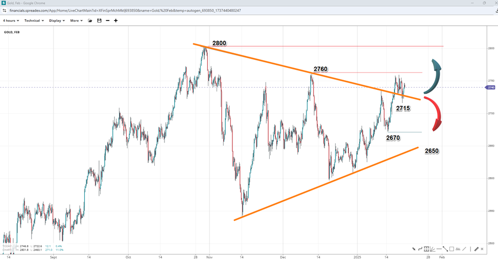 Gold may or may not have completed a triangle pattern at $2670 per ounce. Without a break above the $2760 swing, the triangle pattern may not have been completed, as prices could fall as low as the bottom of the symmetrical pattern near $2650. Holding support at $2715 could add to the upward trend towards $2800 and beyond, with a break lower initially eyeing $2680.