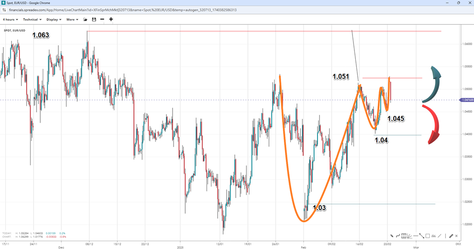 The EURUSD has left behind two cup-and-handle patterns, a medium-term and a shorter-term one, with both facing resistance at 1.051. The handle height of the longer-term pattern opens the door to 1.063, matching the previous resistance. However, if supports at 1.045 and 1.04 weaken in case of a pullback, EURUSD could decline towards 1.03.