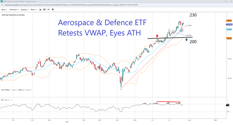 After taking a breather earlier this week down to the 20-period VWAP, the SPDP S&P Aerospace & Defence ETF (XAR) has resumed its upward trajectory. With the RSI moving near 70 but not yet reaching overbought territory, a short-term continuation could meet resistance at the VWAP high at $224.26.