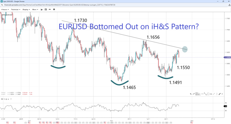 Fibre appears to be consolidating between 1.1656 and 1.1491 after bottoming out at 1.1467 in early November, with the recent peak at 1.1613 acting as a potential rejection of a major descending trendline. Despite corrections typically leading to trend continuations, the entire formation resembles an inverse head and shoulders, with the neckline breakout above 1.1600 increasing the odds of EURUSD rising towards 1.1730 (the measured-move projection comes over 1.1800). If the short-term drop towards 1.1550 reverses course or prices fail to decline as low as the 1.1500 shoulder, the chart pattern could play out. However, losing the swing bottom would bring 1.1491 back into focus, exposing 1.1465 and the major supports of 1.1450 and 1.1400 on the way down.