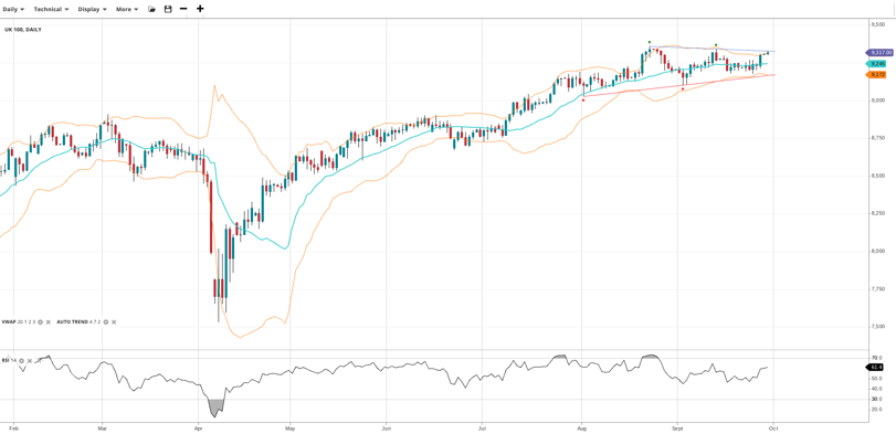 The UK 100 continues in a bullish trend and is currently in a correction (triangle) phase. It is trading at 9,317, above its VWAP of 9,245. The RSI of 61.4 indicates steady buying interest. Support is at 9,172, and resistance is at 9,333.