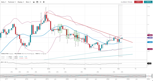 EUR/USD has transitioned to the corrective phase of a bearish trend, with the price at 1.0852, above its upward-sloping 20-period VWAP of 1.0802. The support is now at 1.0724, with resistance at 1.0880. The RSI at 56 indicates a shift to a more positive outlook than previously noted.