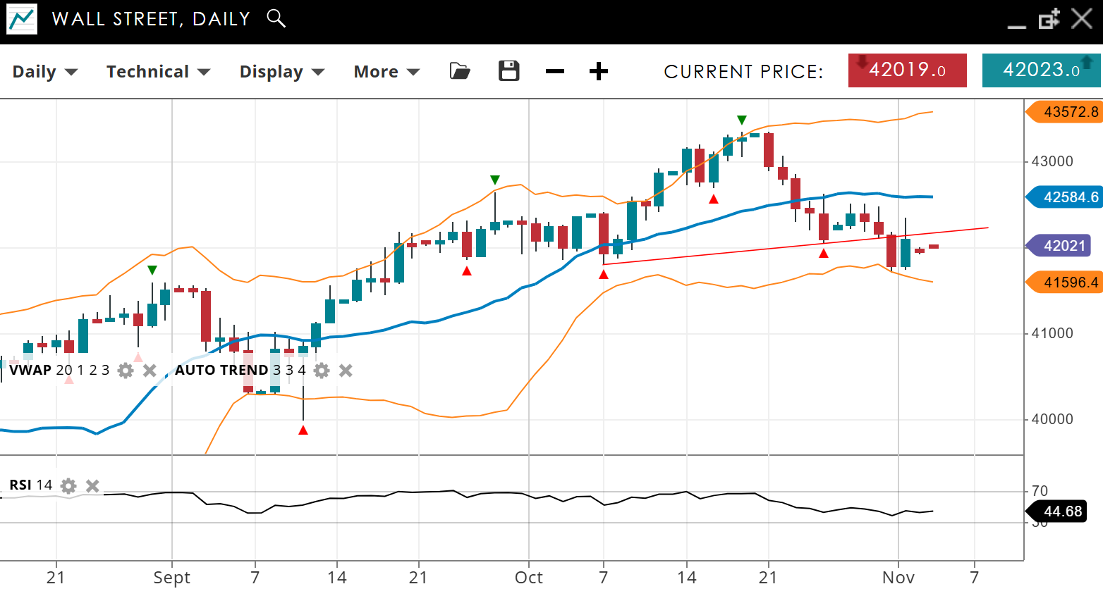 Wall Street is in a bullish but corrective phase, still above the VWAP bands. The current price is 42,021, below the VWAP (20) of 42,584. Support is at 41,596, and resistance is at 43,572. The RSI is 44, indicating waning momentum within the broader bullish trend.