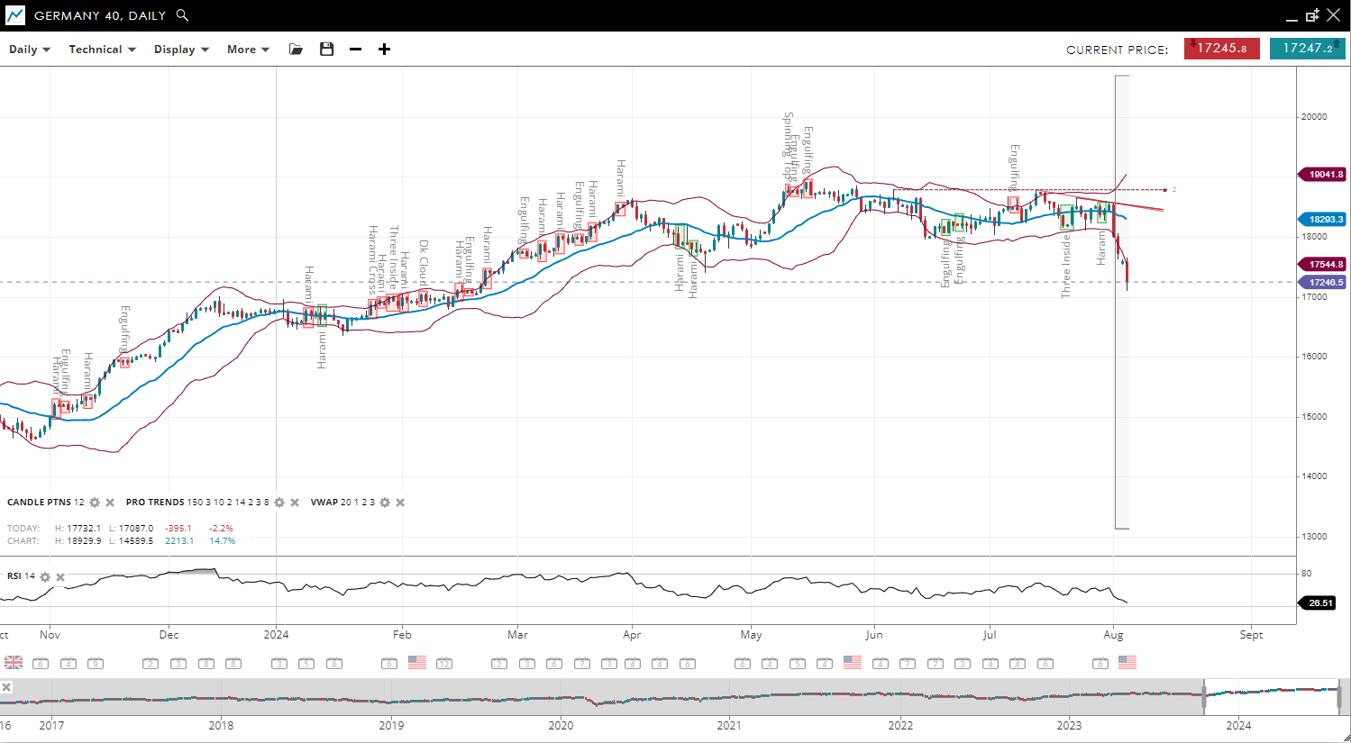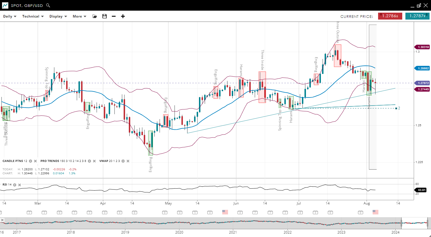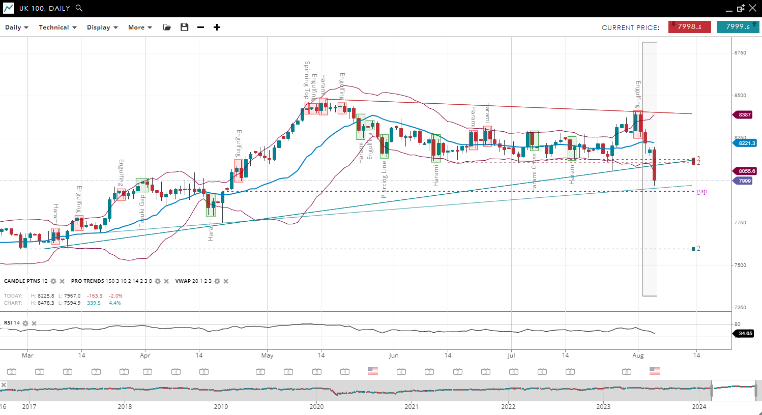 NOTE: These charts use the ‘Pro Trading Tools’ available on the SpreadEx trading platform. To use them, log in to your and click ‘Technical’ from the menu on any chart.