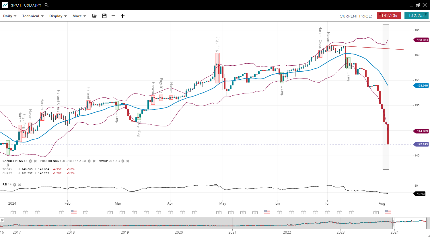 USD/JPY has shifted to a bearish trend and remains in an impulsive phase, with the price decreasing significantly to 142.24, now below the VWAP of 153.94. Support has adjusted higher to 144.86, while resistance has increased to 163.03. The RSI has decreased sharply to 10, reflecting a significant reduction in bullish momentum compared to the previous report.