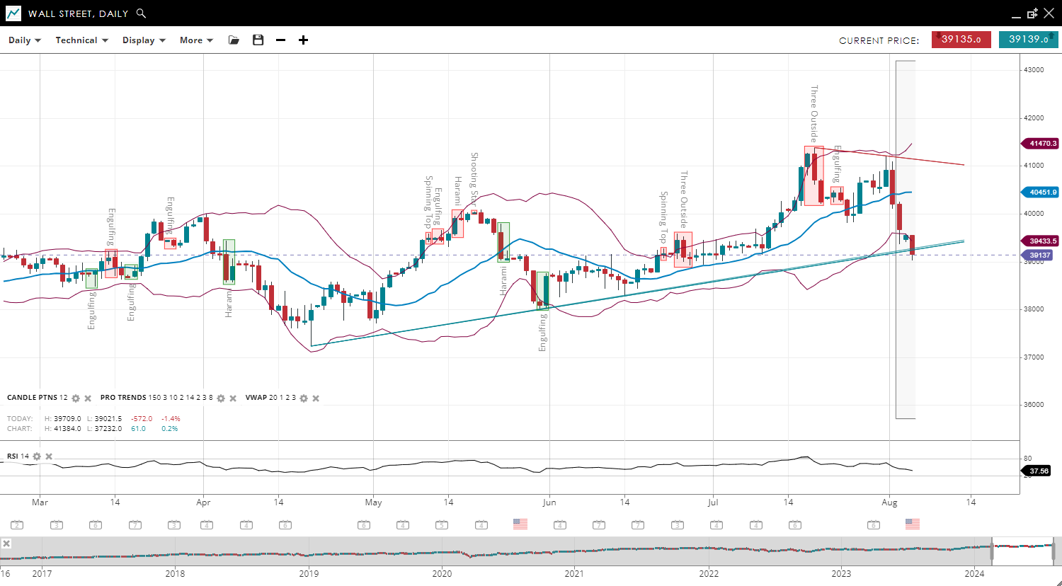 Wall Street remains in a bullish trend but has entered a corrective phase, with the price decreasing to 39,137, now below the VWAP of 40,451. This correction could swiftly turn into a new bearish trend. Support and resistance levels have adjusted to 39,433 and 41,470, respectively. The RSI has decreased to 37, indicating fresh bearish momentum.