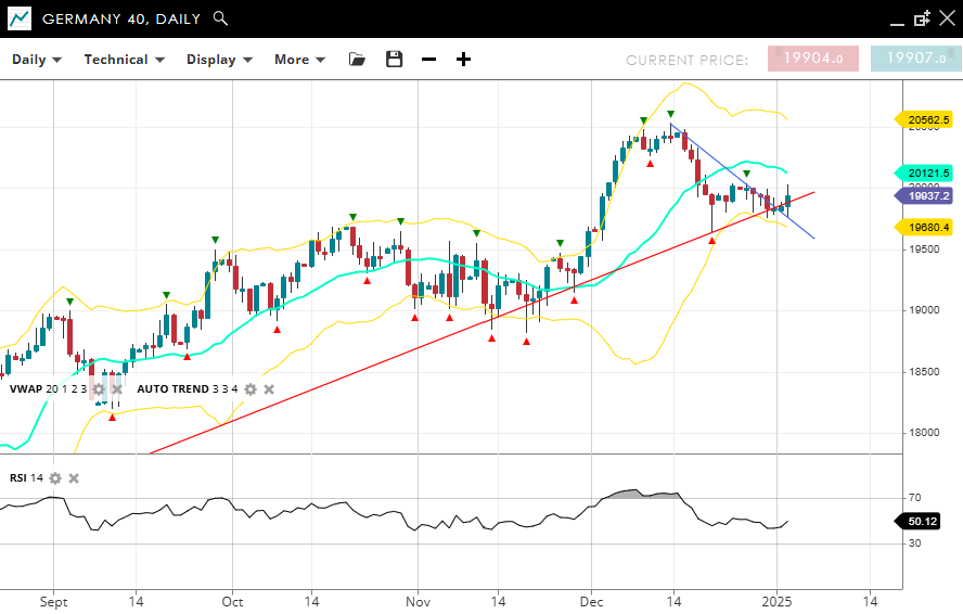 Germany 40 maintains its bullish correction phase, currently trading at 19,937, below the VWAP (20) of 20,121. Support is positioned at 19,680, while resistance is at 20,562. The RSI at 50 reflects neutral momentum, indicating a pause in the prior uptrend.