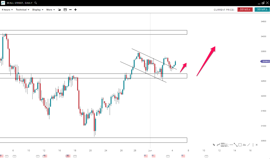 Wall Street is currently in upward movement where higher highs and lows have been posted. The price managed to break the bullish flag to the upside which is a strong signal that the buyers are still in control of the market. The next upside target for Wall Street could be the 33,460 level and if the bulls continue to overwhelm the bears, the price could reach the 34,000 mark.