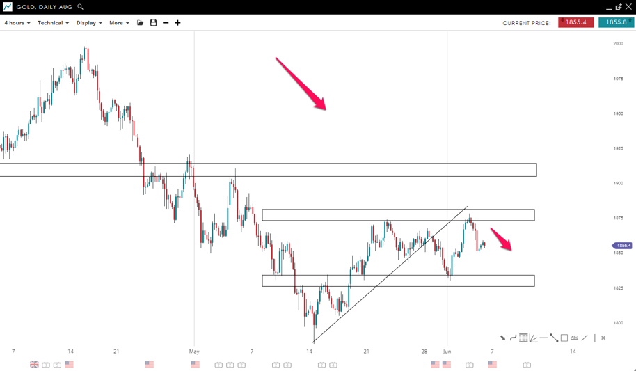 Gold is bouncing inside two key levels, which are 1,830 and 1,875. The market failed to break the 1,875 mark to the upside, which led to a reversal and big selling pressure. The current sideways action looks like a correction before the overall downtrend continues with 1,830 the next major support.