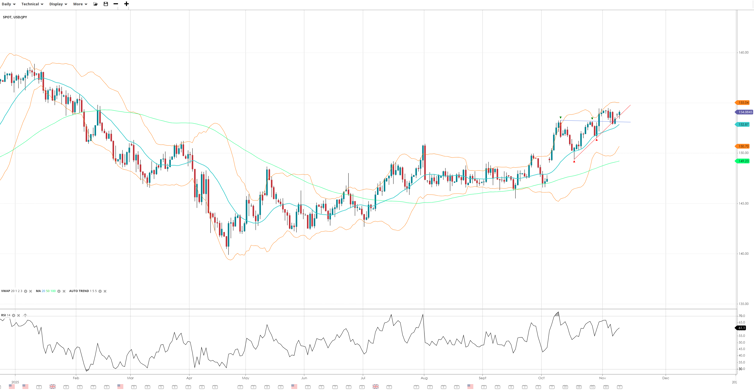 USD/JPY holds a bullish bias while in a pullback, trading at 154.08 above the VWAP of 152.87. RSI at 61.1 confirms ongoing upward momentum. Support lies at 150.70, resistance at 155.04.