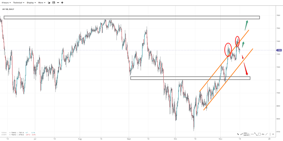 UK 100 is trending strongly higher but has so far has failed to decisively breach 7500, abandoning the attempt at 7650 for a pullback early. Bullish momentum faded above the upward channel twice in a row, with a leg towards the lower trendline below 7300 likely. Losing the channel base will expose 7200 and then the support at 7100. An upside move must first breach 7500.