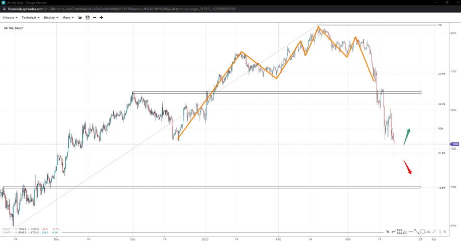 UK’s 100 index remains under pressure following the bearish breakout of the H&S neckline but bounced at the golden pocket at 7220. If the 50% at 7380 holds firm, it might trigger a downward leg towards 7k unless it breaks, sending the index towards 7620.