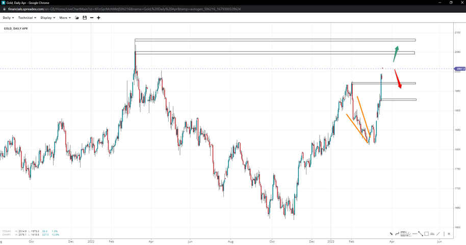 Gold prices might have completed a flag or pennant pattern down at $1810/oz and headed to the 2080 ceiling should bulls regain control of $2050/oz. $1975/oz remains a weekly support bears need control of to push prices deeper to the lower 19s.