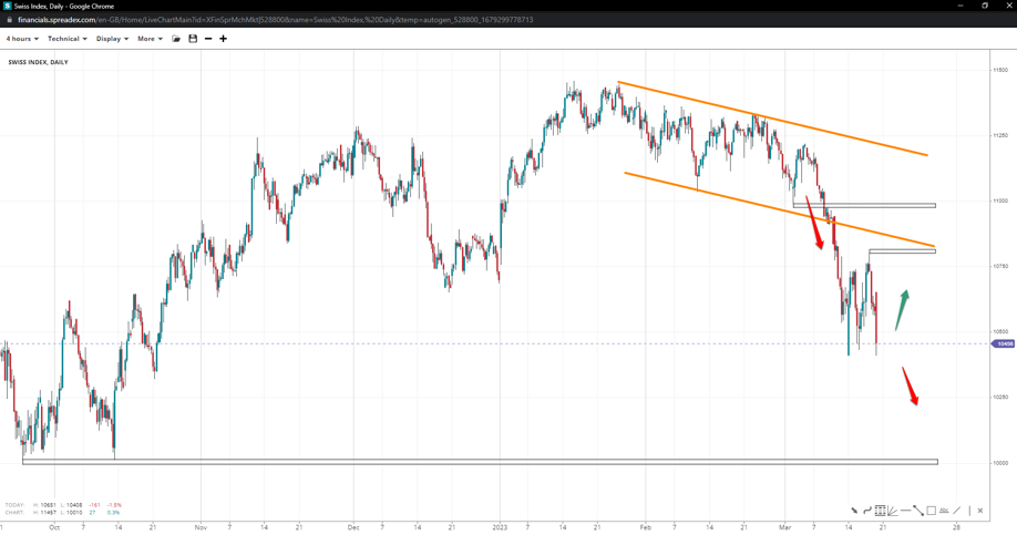 The Swiss index broke the bottom of the descending channel off 11380, exposing the 10k threshold. Failing to gain traction towards 10800 might provoke additional short bets unless bulls attempt 11k.