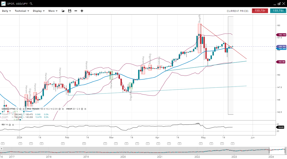 | USD/JPY | Neutral | Consolidation | 155.76 | 155.38 | 152.66 | 158.11 | 54 |