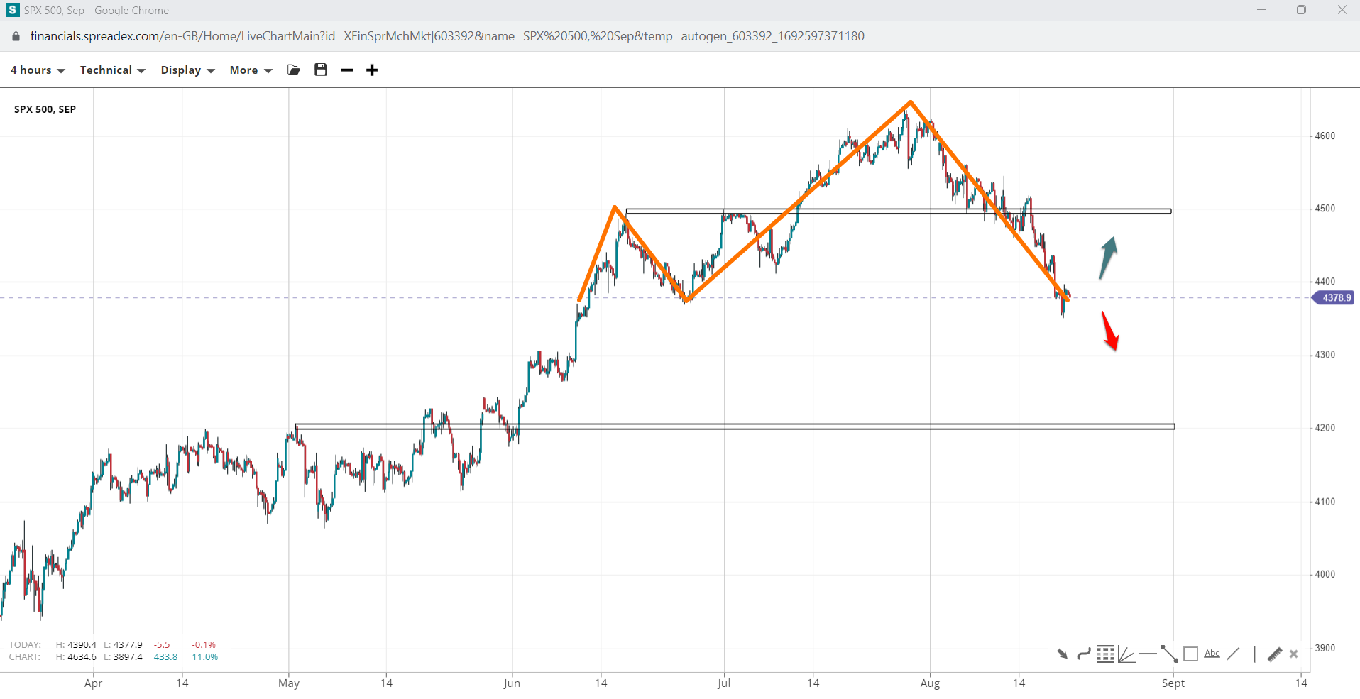 While the S&P 500 trades above 4370, the chances of a head-and-shoulders pattern remain intact, opening up 4500. Losing the regional swing could send prices towards 4200, with interim support near 4300.