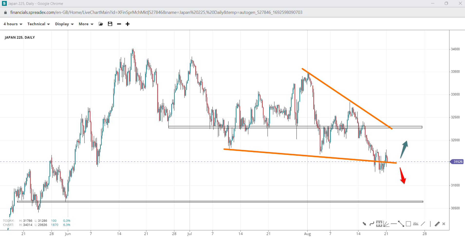 A wedge pattern may offer some respite in Japan’s 225 index, paving the way to 32300 unless 31790 repels bullish price action. If declines continue under 31250, extending losses to 30650 may be possible, invalidating the wedge pattern.