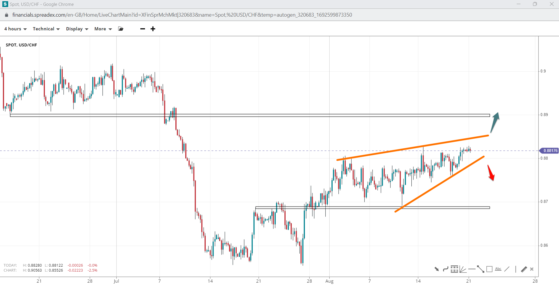 The double top formation on USD/CHF might have put the top in in the context of a wedge pattern. If prices ease under 0.8744, it may clear the path to the round 0.87 support. Otherwise, a fresh spike upwards might provoke a move to 0.89, invalidating the wedge and potentially experiencing further ascends.