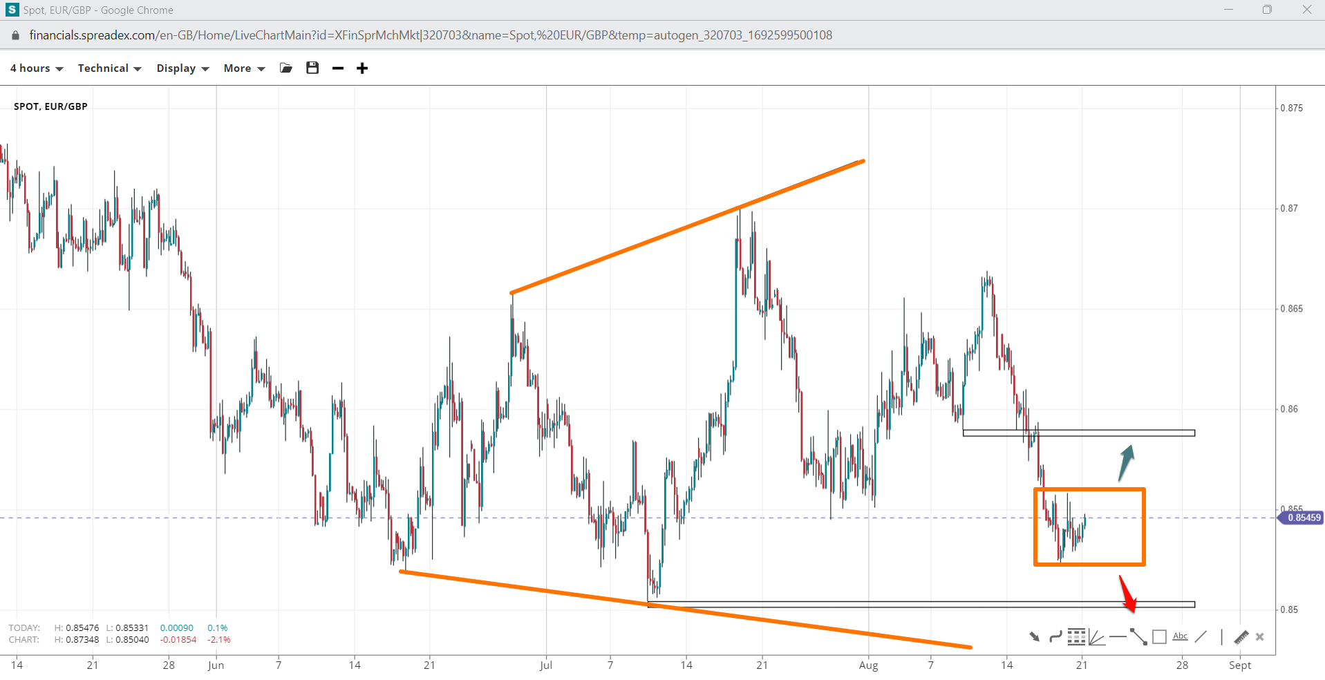 The EUR/GBP pair could still be in a broadening triangle, pending declines below 0.85. Short-term price action requires a breakout from the 0.8520-0.8560 range for further clarity, with a potential move past the upper side seeing the probability at 0.8586 increasing.