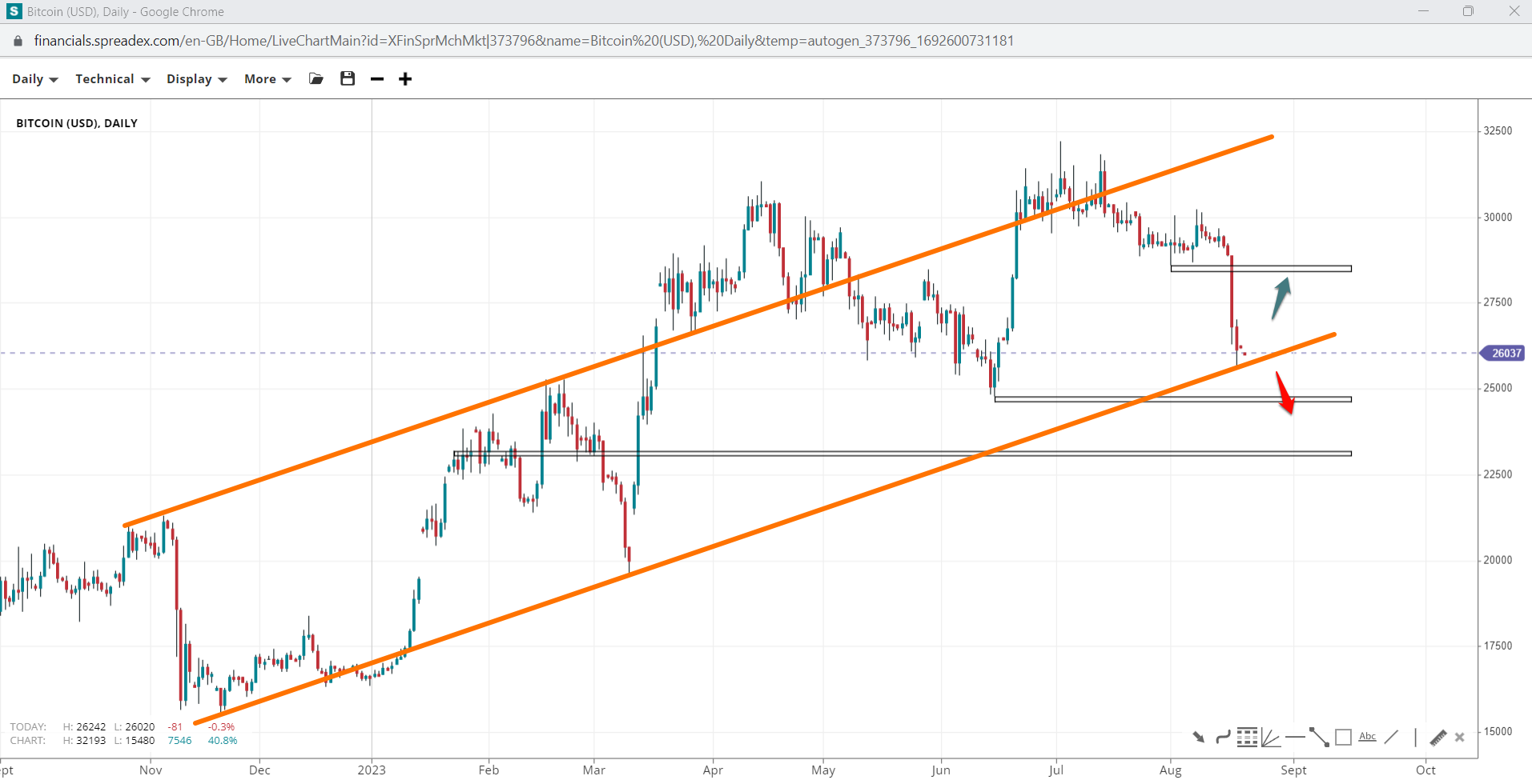 The price of Bitcoin may be due to further declines as it tested the lower end of the ascending channel starting at 15480. If bearish momentum increases to trigger a drop under $24700, the support at $23k could be revisited sooner than later. Otherwise, reclaiming $28500 is of utmost importance for bullish continuation.