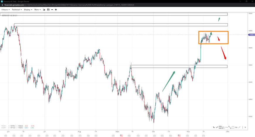 Germany 40 seems to have broken outside its sideways range, with bulls paving the way towards the 15k handle. 14720 is major double-top resistance where a pullback could be expected. If the support at 14150 or the 14k stronghold gives in, 13500 returns to the spotlight.