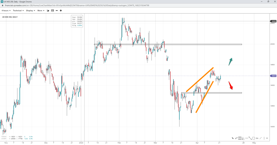 UK’s 250 has formed a diagonal pattern around 19420 and retraced towards 19000. The index is currently trading in a sideways market, and bulls must push past the local top to continue the rally towards 20k. A breakdown below the support level at 18815 could signal a double bottom around 18000.