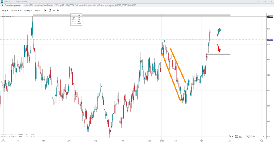 Platinum prices traded higher last week, breaking past $1120 per ounce, confirming a flag pattern at $900. If bulls reclaim the resistance at $1200, we may see an extended leg up unless 1070 gives in to potential pressure.