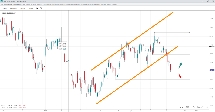 Hong Kong's 50 index fell outside its ascending channel, with key resistance and support levels at 20750 and 19500, respectively. The bulls need to propel prices above 20200 quickly or risk a potential double bottom at the swing low, while a breakdown lower could signal a decline toward 19000.