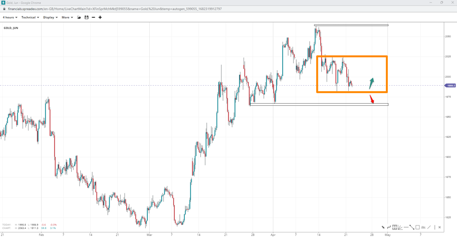 Gold trades in a range with key resistance and support levels at $2030 and $1980 per ounce, respectively. A break above $2030 could pave the way for a potential rally toward the peak. On the other hand, if prices break below $1965 per ounce, we may see a continuation of the bearish trend.