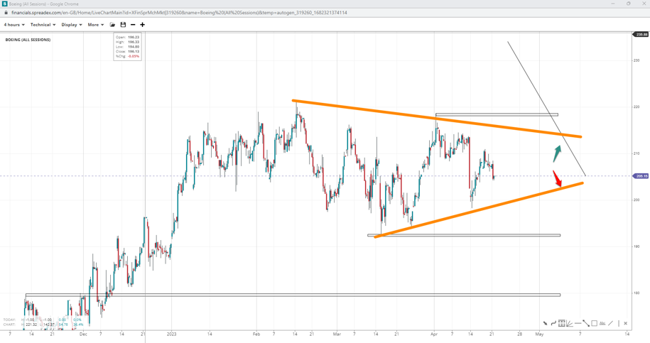 BOEING appears to form a triangle that might end around the $200 handle. Forming the pattern may open the door to $230 and beyond if the measured move played out successfully. Conversely, failing to get past $220 or falling under $190 may invalidate the pattern and print a deeper flag instead, clearing the path to $180.