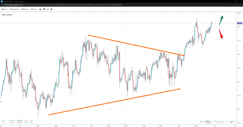 EUR/JPY has completed a triangle pattern at 138.78, sending prices to 151.67. A rally towards the top could trigger a breakout toward 152, and perhaps higher unless the pair goes into consolidation. If conditions shift, the break of 146 might be followed by further declines toward the 145.50 mark but unlikely lower.