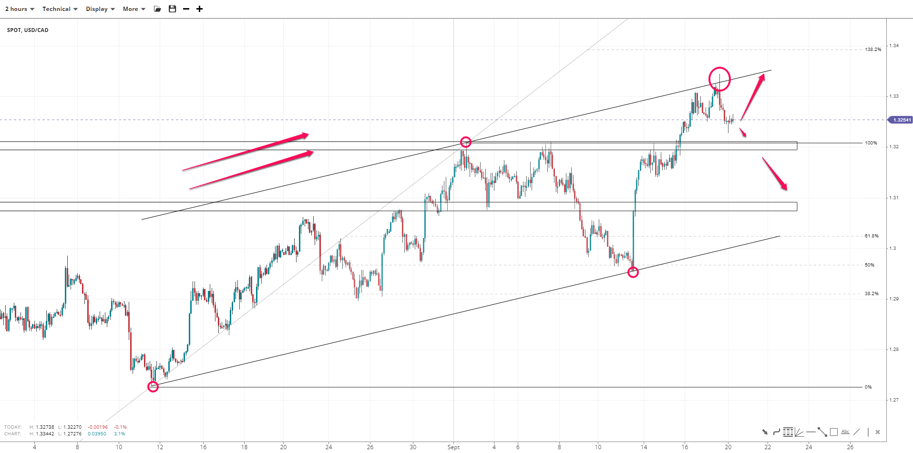 USD/CAD remains bullish above the 1.3200 handle with key resistance at the 138.2% Fibonacci of 1.2725-1.3200 near 1.3400. The rejection at the channel top near 1.3350 opens speculation of a move towards 1.3100 unless the round support holds.