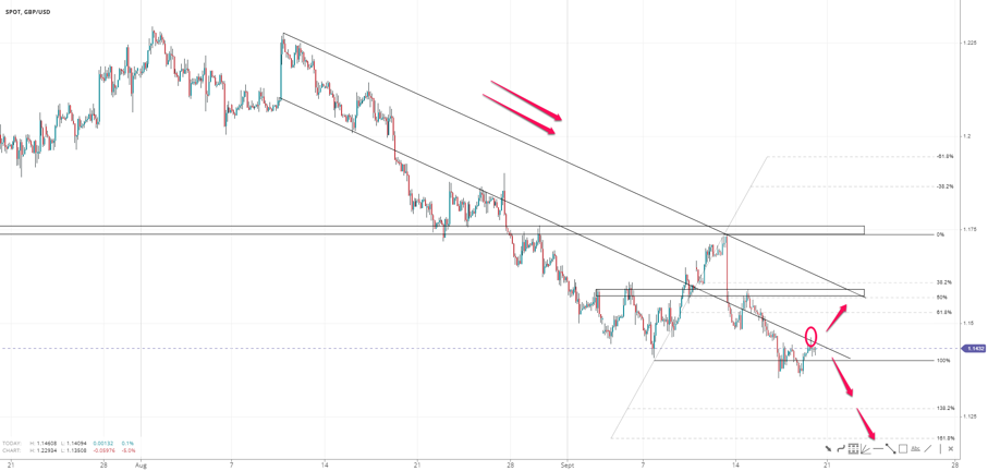 GBP/USD met stiff resistance at 1.1730 and reversed to a fresh low near 1.1350. 1.1270 is key Fibonacci support above the 161.80% equivalent at 1.1190. Outside the channel, downside risk remains elevated unless bulls recapture 1.1500 for a chance at 1.1600 near the 38.2% Fibonacci.