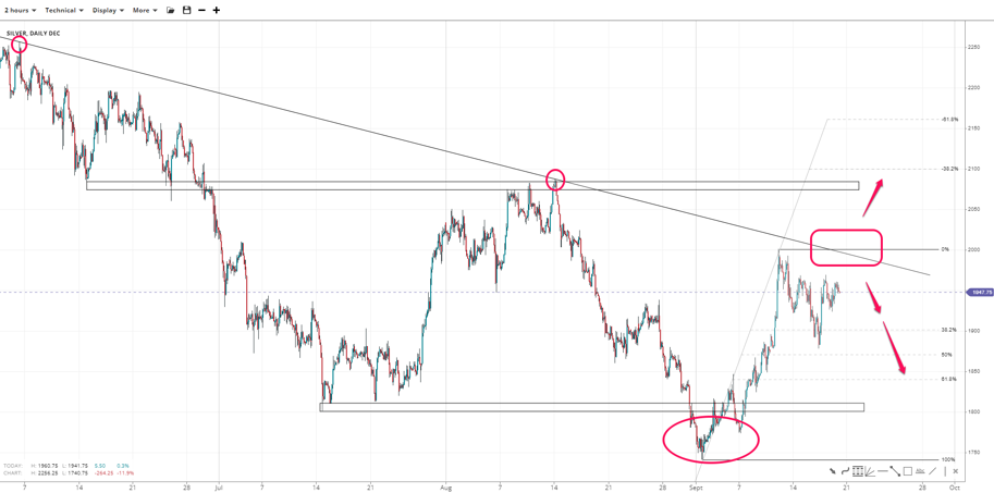 Gold fell to 1660 before starting to form a bearish flag towards 1700, with next support at 138.2% of 1825-1700 near 1650. If the retest fails on weak momentum it exposes 1600, whereas breaking past the local top might rev gold up the golden pocket of 1750 if 1730 softens.