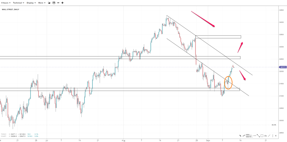 Wall Street tumbled outside the bearish channel in what seems to be an accelerated leg towards 29000. If support weakens there, 28000 is next, as round level. In case of a break above the 138.2 of 34300-31000  near 29730, bulls will eye 30500 above the 30000 handle, with a high at 31000.