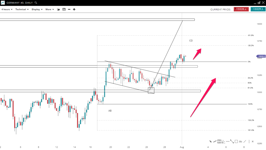 GER40 successfully broke the bullish flag formation to the upside and the price is trading above the resistance level (now support) near the 13,380 mark. The market could move higher toward the 13,875 mark to complete the ABCD pattern. A close below the 13,000 would neglect our bullish view.