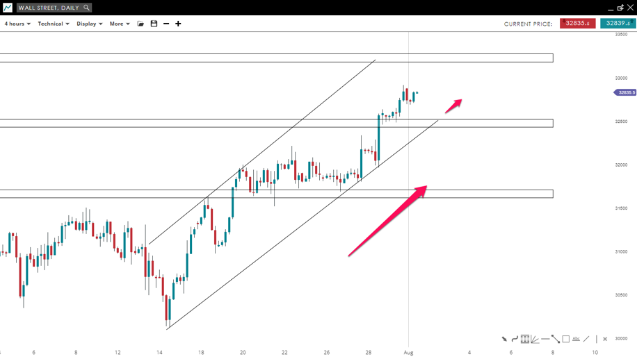 Wall Street is trading inside a bullish channel formation where the price found support near the 32,500 mark. A slight correction to the pivot level could be seen before the buyers rejoin the uptrend and push the price towards the 33,245 mark. A drop under 31,600 would negate this bullish view.