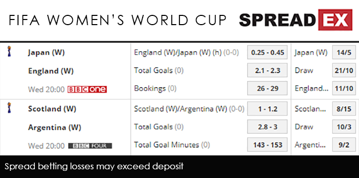 There is an added element to the final group game that could make it important from a psychological perspective. Japan – 2011 champions and 2015 beaten finalists – were the side that muted the roar of the Lionesses last time out, Laura Bassett’s injury time own-goal heartbreakingly sending England out in the semi-finals. Following a frustrating goalless draw against Argentina, Asako Takakura’s women got their competition back on track with a 2-1 win over Scotland in Renne, costing off their 2-0 lead in the 1st half. That means they would need a win to top the group, a move that would help them avoid Netherlands or Canada in the next round. England are among the most fancied sides in France. Their Outright Index spread of 44-48 teases another semi-final, placing them behind the USA at 48-52, Germany at 48-51 and the hosts at 47-50. Japan, on the other hand, are at 26-29, suggesting the might struggle to make it 3 finals in a row. Steph Houghton and co. can make a statement with a win on Wednesday, especially if they do so with a rotated starting 11. Spreadex have them at an England/Japan Goal Supremacy spread of 0.3-0.5, alongside a Total Goals spread of 2.1-2.3. Scotland vs Argentina, 8pm on BBC FourFinally reaching a World Cup proper, Scotland’s competition is already at risk of being over. Their losses may have been narrow, but they’ve been losses nonetheless, leaving their without a solitary point going into their final game. There is still hope. There’s every chance they will beat a pretty lifeless Argentina, with Spreadex offering a Scotland/Argentina Goal Supremacy spread of 0.95-1.15, alongside a Total Goals spread of 2.75-2.95. Then they would need to pray that Chile, Thailand, New Zealand and Cameroon don’t pick up better goal difference records.
